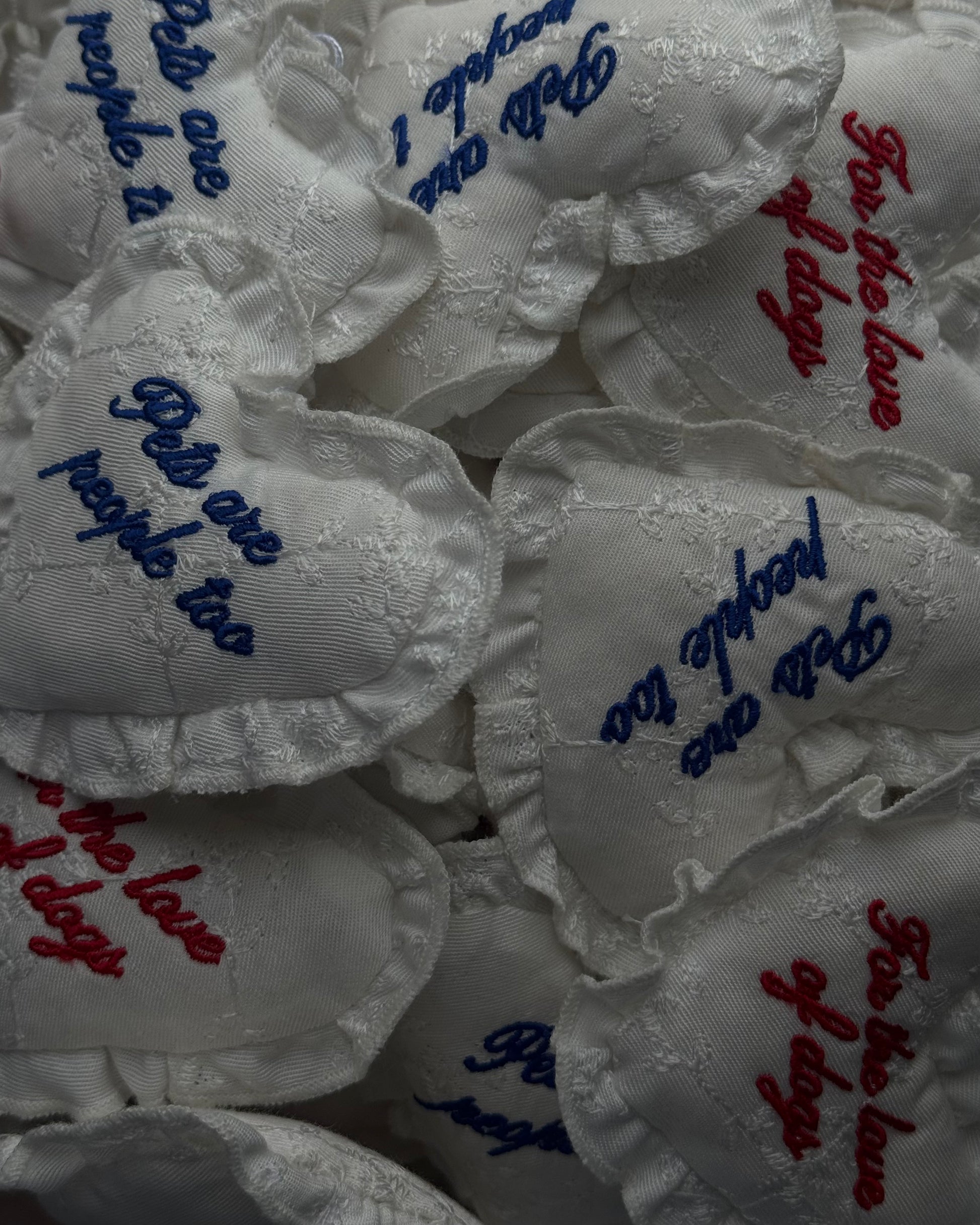Embroidered with For the love of dogs in red or Pets are people too in blue.