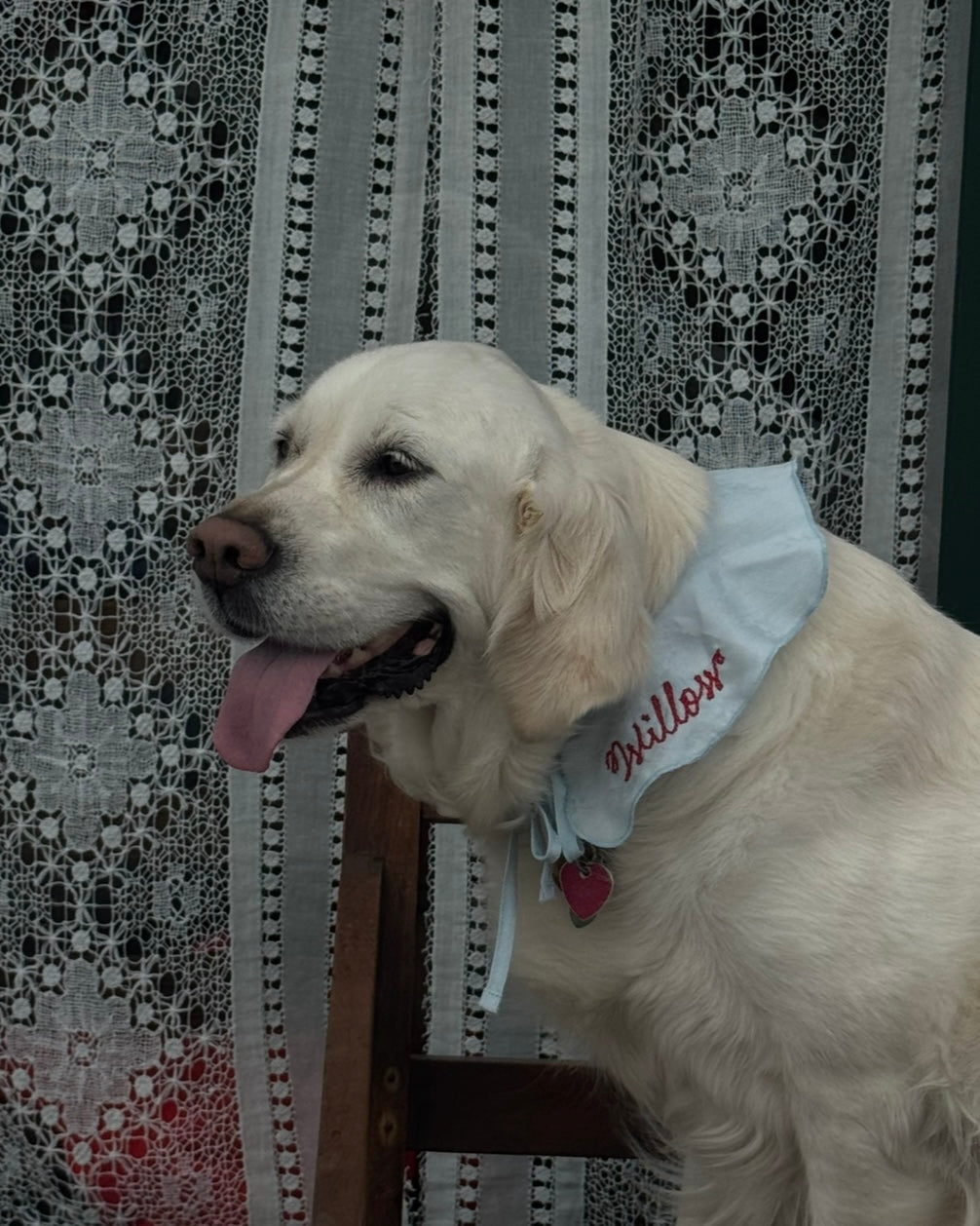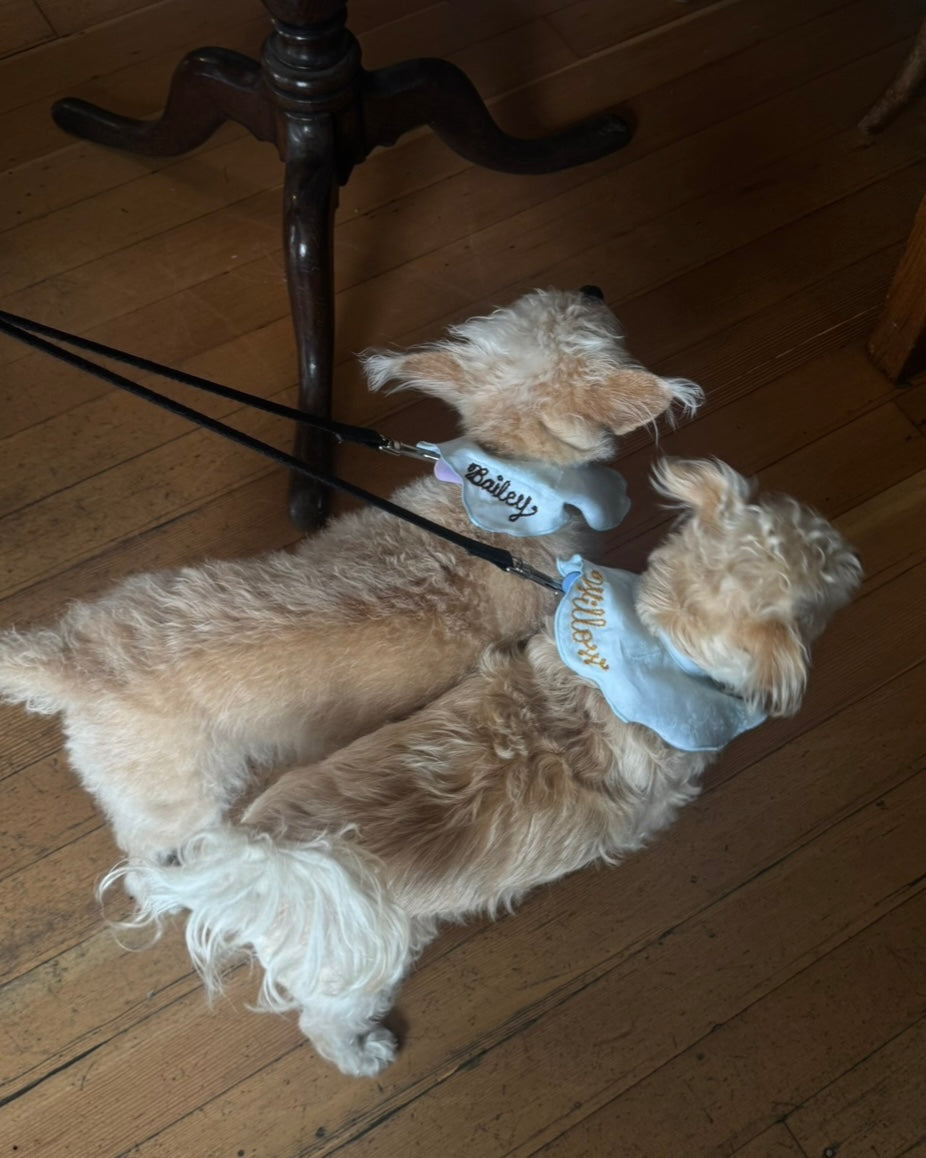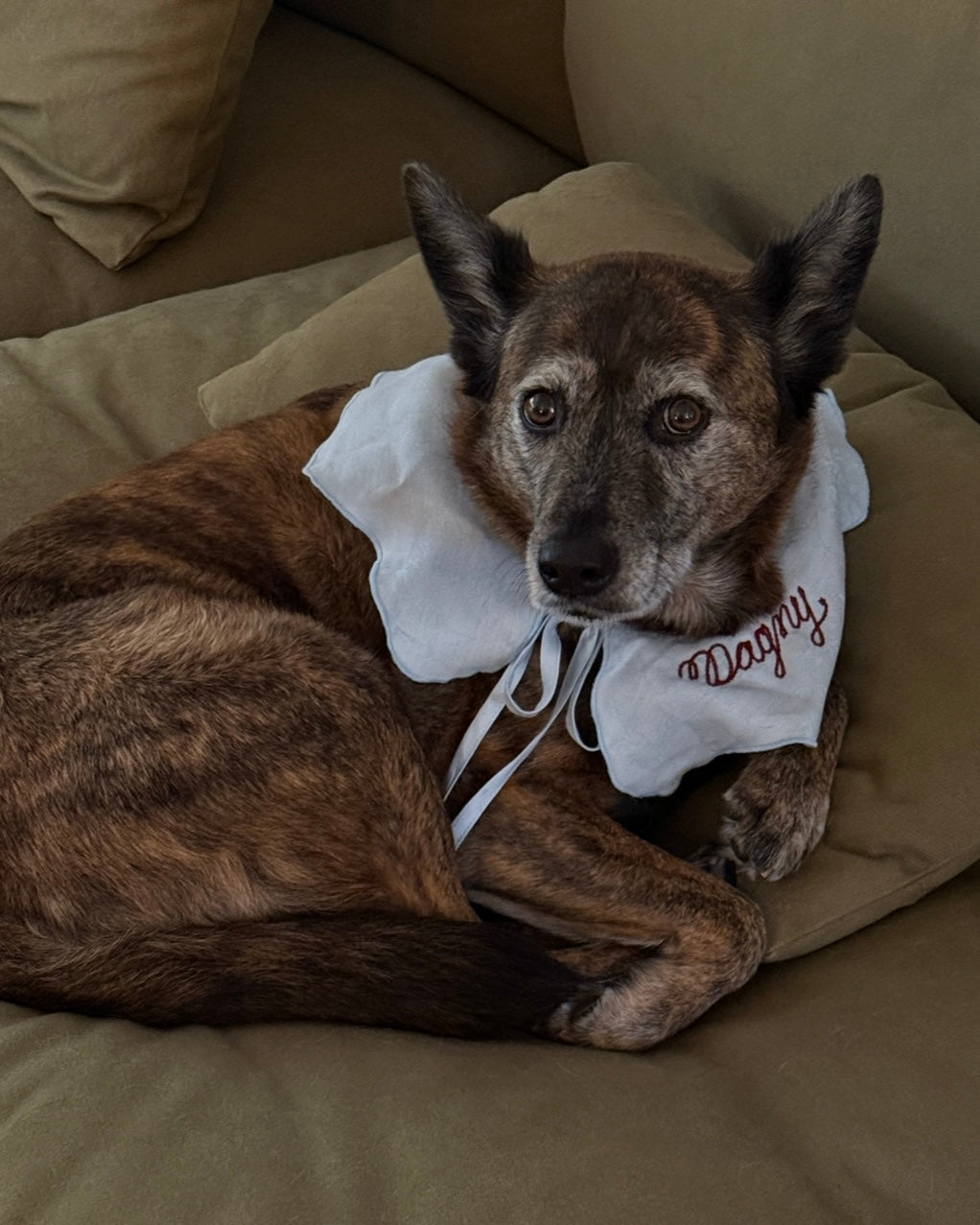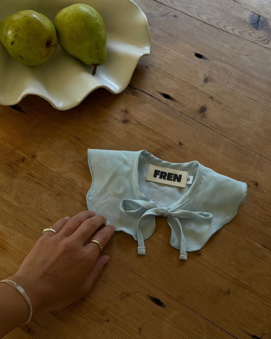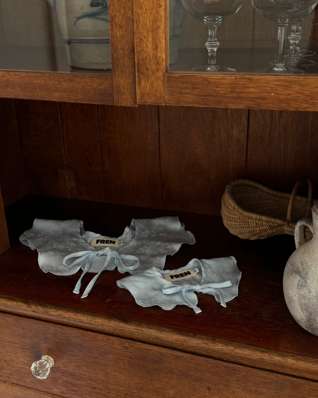 FREN x Bucatini collab made with a beautiful baby blue floral fabric. Our precious, beloved collar made for your furry fren. This style was named after my second dog, Wanda Jean.